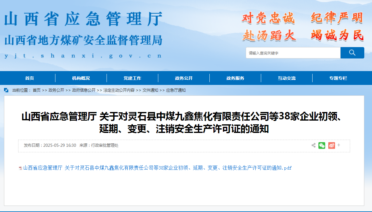 山西省應(yīng)急管理廳 關(guān)于對(duì)靈石縣中煤九鑫焦化有限責(zé)任公司等38家企業(yè)初領(lǐng)、延期、變更、注銷安全生產(chǎn)許可證的通知